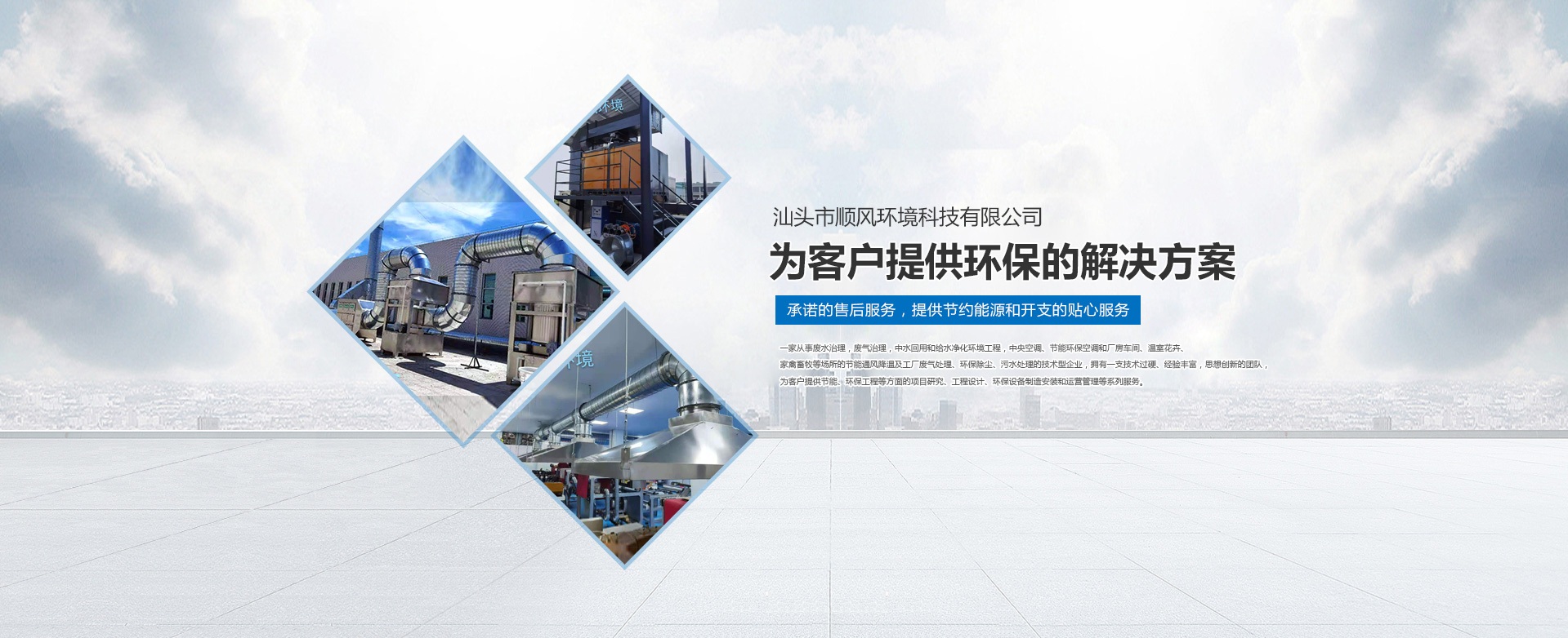 汕頭市順風環境科技有限公司,是一家專注從事廢水治理,廢氣治理,中水回用和給水凈化環境工程,中央空調、節能環保空調和廠房車間、溫室花卉、家禽畜牧等場所的節能通風降溫及工廠廢氣處理、環保除塵、污水處理的技術型企業,擁有一支技術過硬、經驗豐富,思想創新的團隊,為客戶提供節能、環保工程等方面的項目研究、工程設計、環保設備制造安裝和運營管理等系列服務。 多年來,公司堅持 “ 誠信于人,業精于勤” 的宗旨,憑借豐富的工作經驗及雄厚的技術實力為多家大型公司、工廠、養殖、超市等大型綜合場所進行節能通風降溫及廢氣處理、污水處理等工程設計、安裝、維修、年度保養,得到了顧客的一致好評并長期合作。